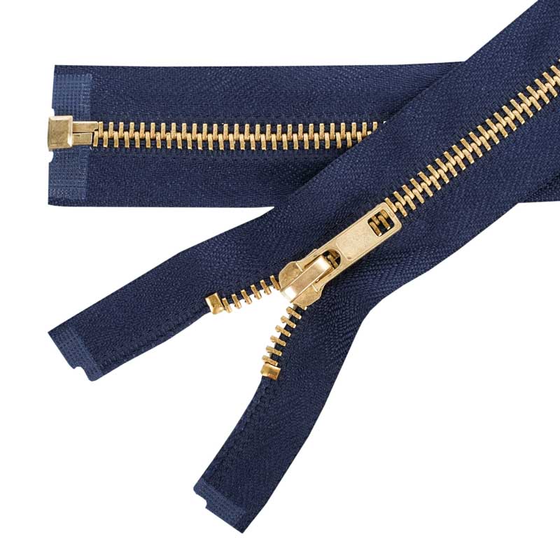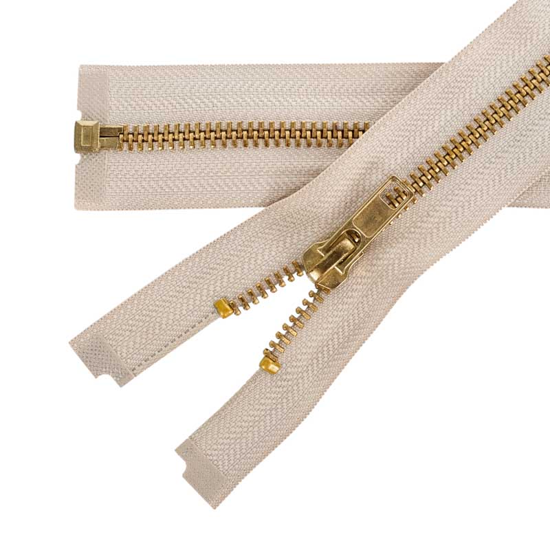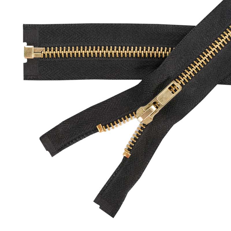 Sárgaréz fogazatú nyitható cipzár (bontható) 40 cm hosszú. 5 mm széles fém fogazattal rendelkezik, erős és tartós típus. A hordozó textilszalag szélessége 3,3 cm. Alkalmas például ruházati cikkek, lábbelik, dekorációs termékek, táskák, nadrág slicc és zseb, kabátzsebek készítésénél és javításánál.