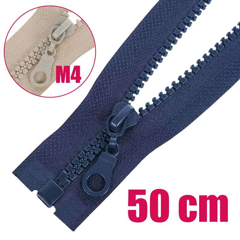 Öntött műanyag fogazattal rendelkező bontható (nyitható) cipzár. Ezt a típusú cipzárt hívják cápafogú, farkas fogú cipzárnak is. A fogazat szélessége 5 mm, a cipzárszalag teljes szélessége 3,2 cm. A fogazat színe megegyezik a textilszalag színével, a cipzárkocsi kör formájú (M4). A cipzár hossza: 50 cm