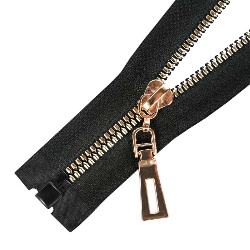 Nagyon esztétikus, arany színű polírozott műanyag fogazattal rendelkező cipzár. A különleges fogazat 5 mm széles, a hordozószalag teljes szélessége 3,5 cm. Attraktív cipzár, így a legnagyobb esztétikai elvárásoknak is megfelel. A cipzárszalag színe fekete (332). Nyitható, vagy más néven bontható kivitel, alkalmazható például pulóver, dzseki, kabát, blézer készítésénél. Nagyon dekoratív cipzárkocsival szerelve.