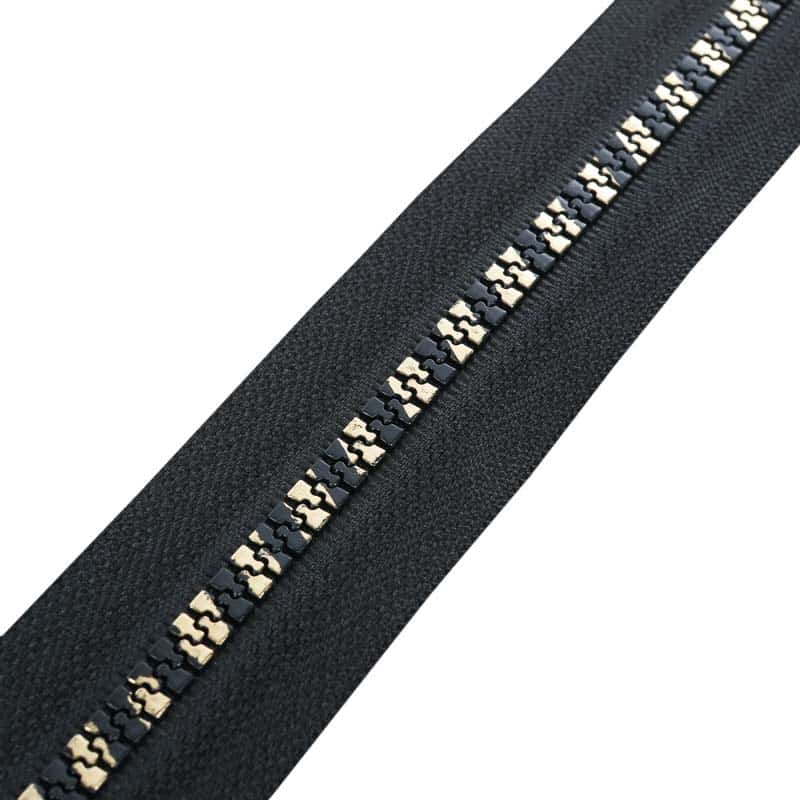 Nagyon esztétikus, polírozott műanyag fogazattal rendelkező cipzár. A különleges fogazat 5 mm széles, a hordozószalag teljes szélessége 3,5 cm. Attraktív cipzár, így a legnagyobb esztétikai elvárásoknak is megfelel. A cipzárszalag színe fekete (332). Nyitható, vagy más néven bontható kivitel, alkalmazható például pulóver, dzseki, kabát, blézer készítésénél. Nagyon dekoratív cipzárkocsival szerelve.